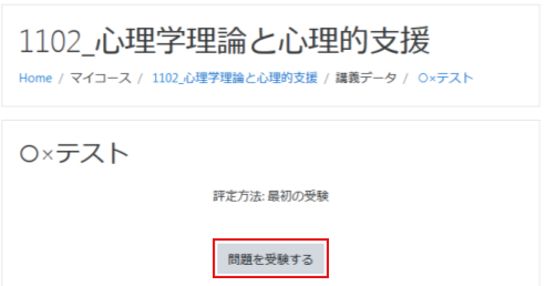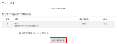 | ⑪レビューを終了すると受験概要画面が表示されます。 ※「もう一度受験する」をクリックすると、再度問題を解くことができます。 ※成績評価は最初の受験が対象となります。 |
