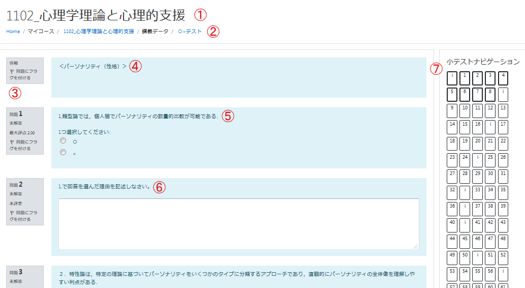 | ③問題番号 | 小テストナビゲーションと連動しています。 |