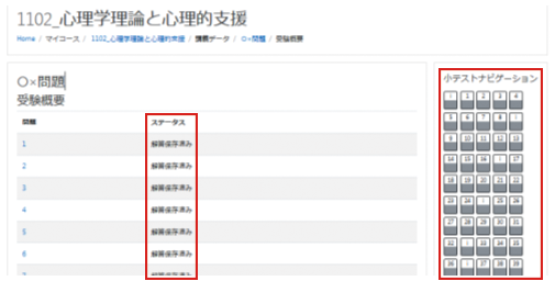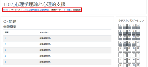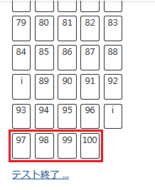 テストの進捗を確認することができます。 未回答の場合、白く表示されます。 回答すると、色がつきます。※他のページに移動するまで回答は保存されません。 ※小テストナビゲーションの番号を押すと該当の問題に移動します。 |