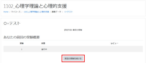 | ⑥回答を再開する時は、問題ページの「前回の受験を続ける」をクリックします。 | |