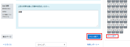 | ≪すべての回答が終わった場合≫ ⑦すべての回答が終了したら、最終ページ画面一番下の「テスト終了...」をクリックします。 ※小テストナビゲーションの中にも同じボタンがあります |