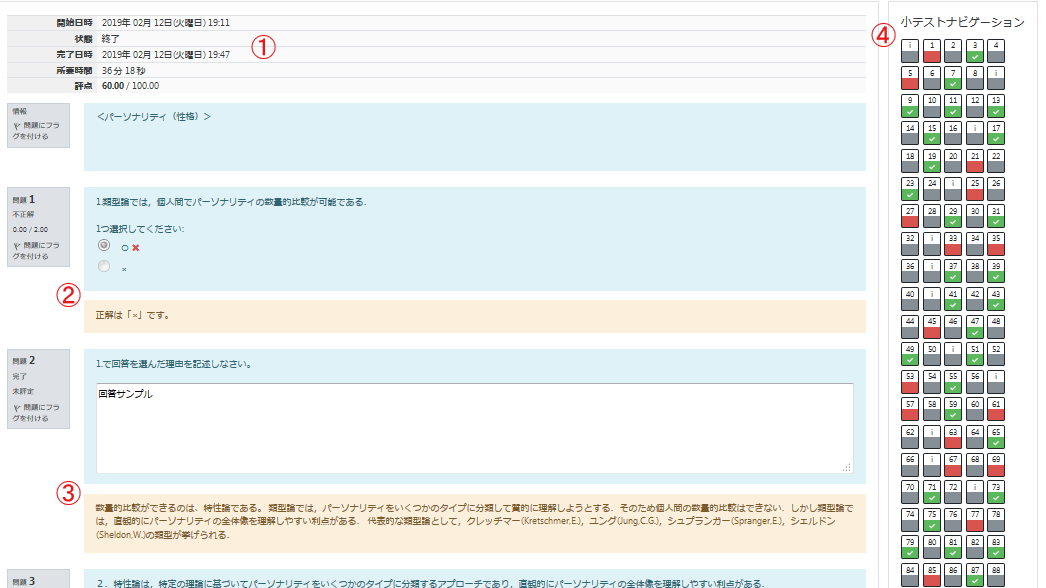 | ①受験概要 | 完了日時、所要時間、評点が確認できます。 |