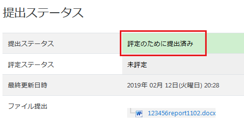 | 提出ステータスに「評定のために提出済み」と表示されていれば、提出完了です。 | |
