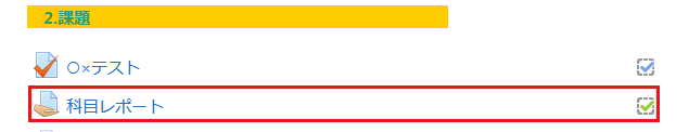 添削が完了し、レポートが返却されると☑が着いています。 ※合格だと緑の☑、不合格だと赤の☒が着いています。 ①「科目レポート」をクリックします。 |