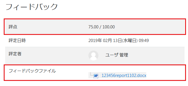 画面下部、フィードバックより、 レポートの評点とフィードバックファイルが確認できます。 ②フィードバックファイルをクリックします。 |