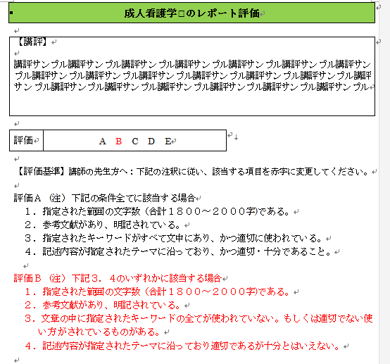 レポートの最後に評価があります。 講評の中身を確認してください。 評価は該当する評価・項目が赤字になっています。 確認が終わったらファイルを閉じてください。 |