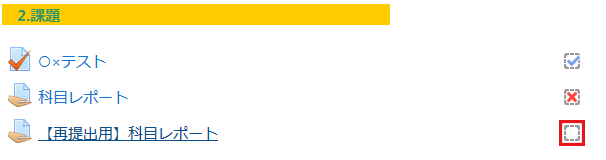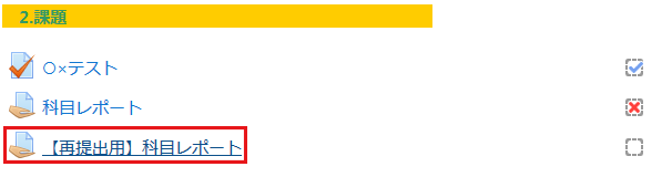 科目レポートが不合格だった場合(赤の☒)、もしくは提出期限までに科目レポートを提出していない場合、レポートを作成し、再提出をおこなってください。
