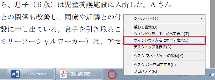 | ⑤タスクバーのグレーの領域で右クリックし、ポップアップメニューから「ウィンドウを左右に並べて表示」を選択します。 | |