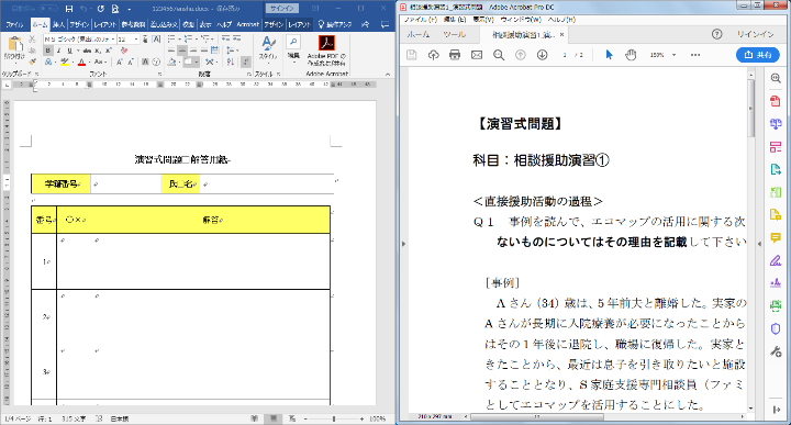2分割するウィンドウを表示します。 ③タスクバーの解答用紙ファイル(Word)をクリックします。 ④タスクバーの問題ファイル(pdf)をクリックします。 |