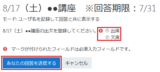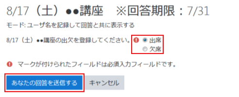 質問一覧が表示されます。 ③該当する項目(出席または欠席)にチェックを入れ、「あなたの回答を送信する」をクリックします | |