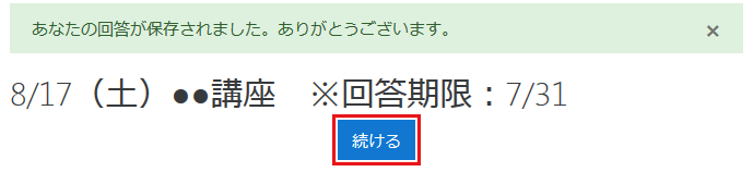 回答送信完了画面が表示されます。 ④「続ける」をクリックします。 | |